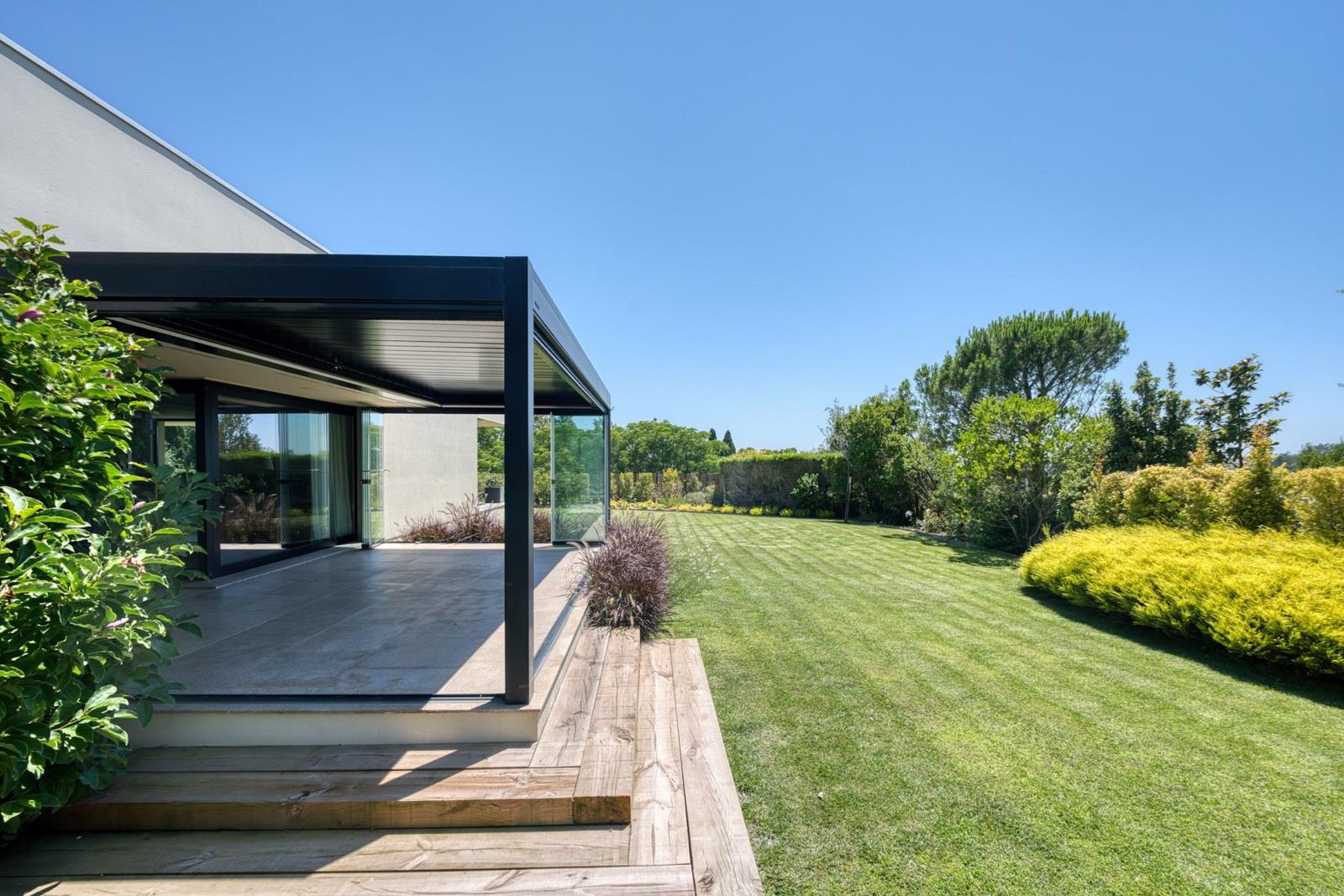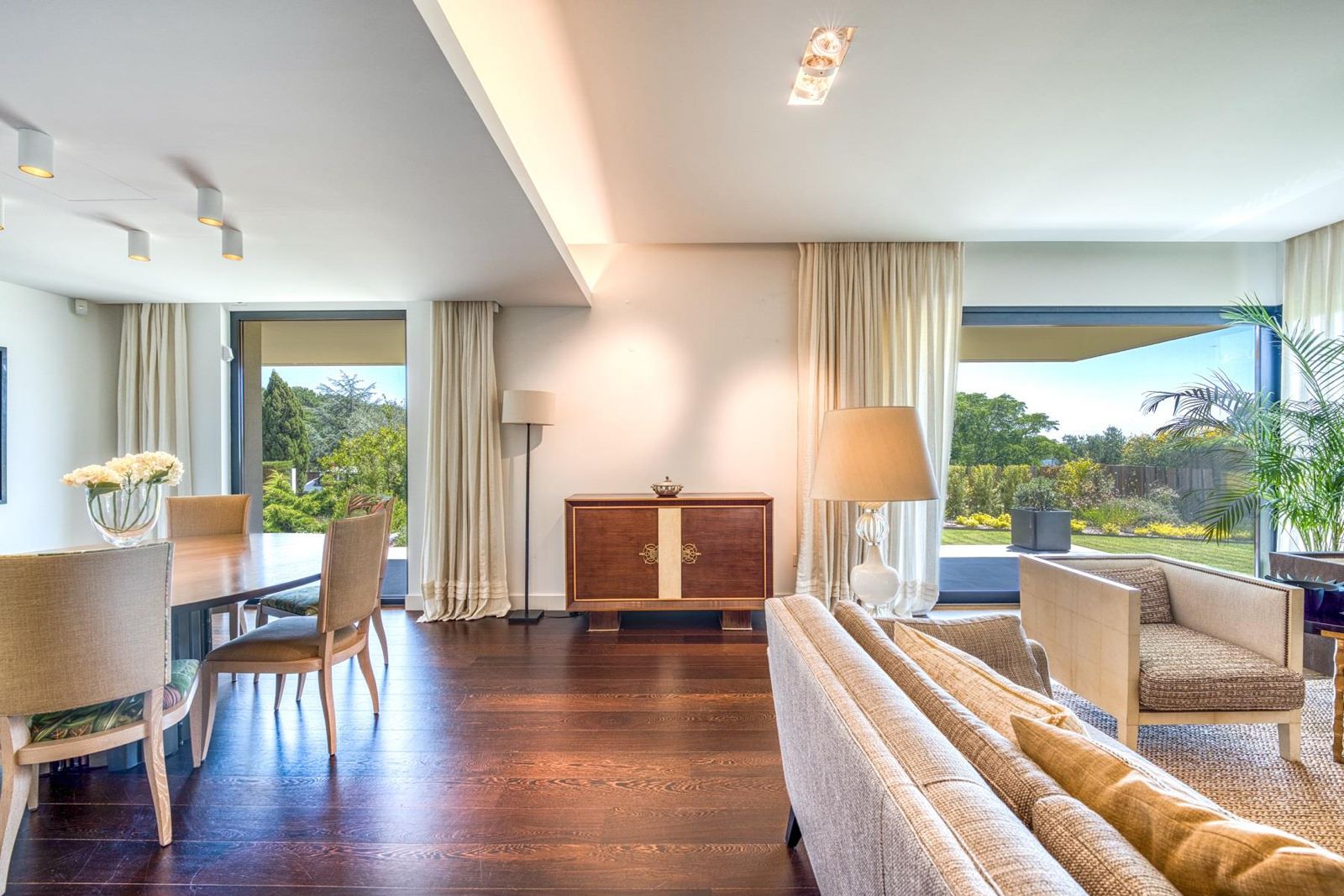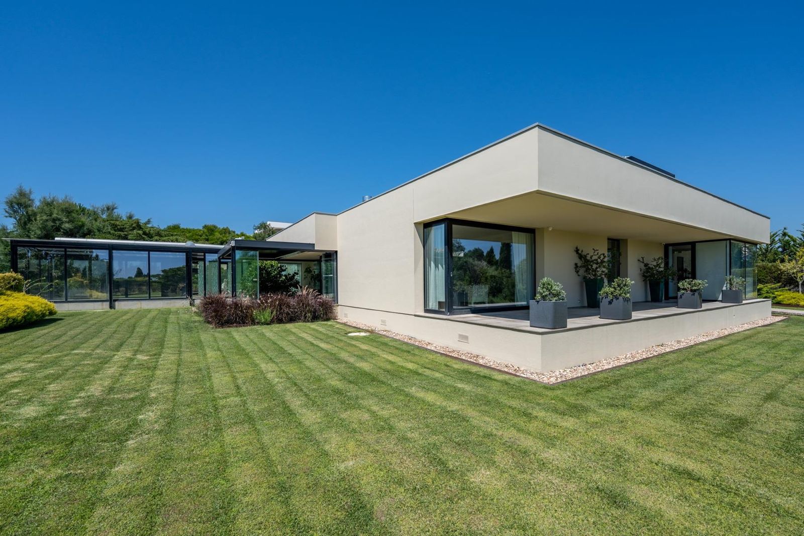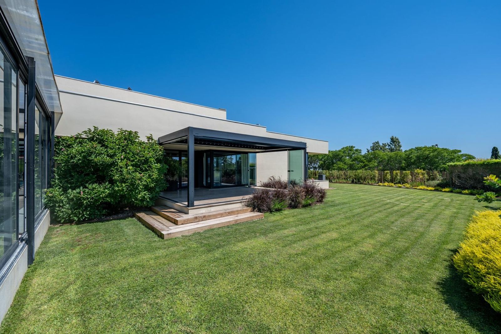 Esta villa de estilo contemporâneo, concebida para conforto e elegância, oferece cinco quartos com casa de banho privativa e aquecimento por piso radiante em todos os espaços.