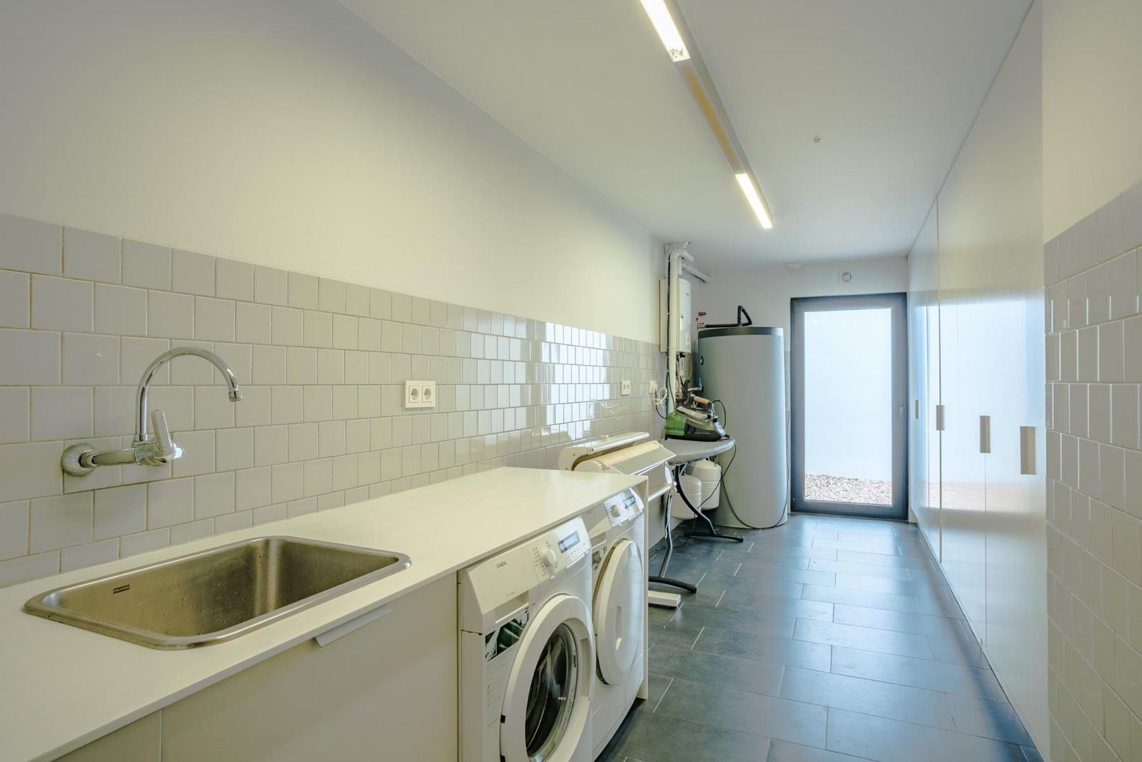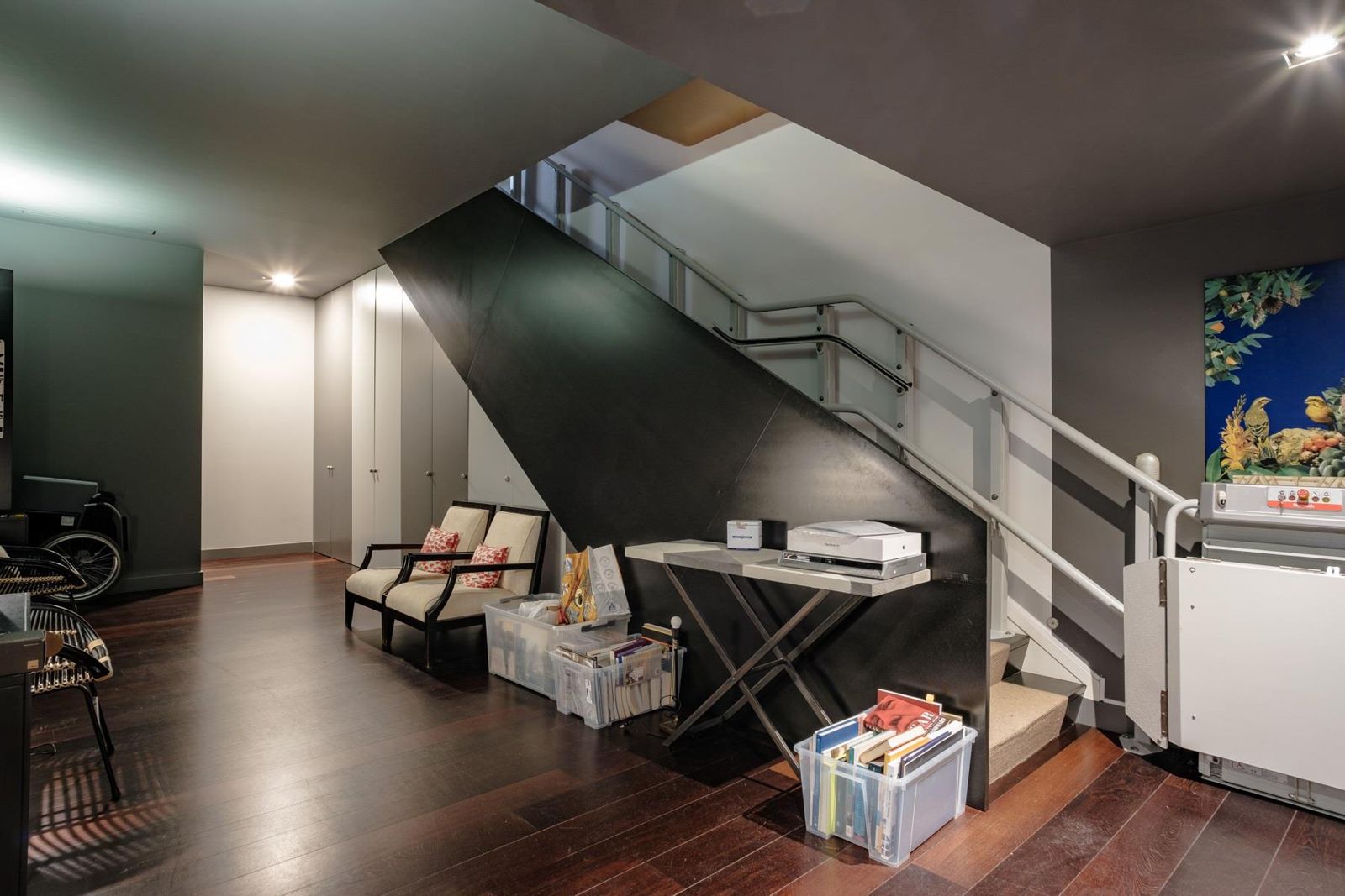 Este nível inclui uma área de lavandaria, amplo espaço de arrumos, um quarto de hóspedes e uma garagem generosa para três viaturas.