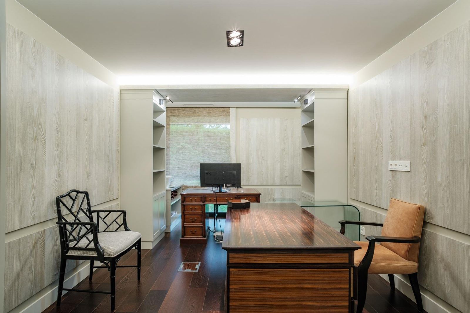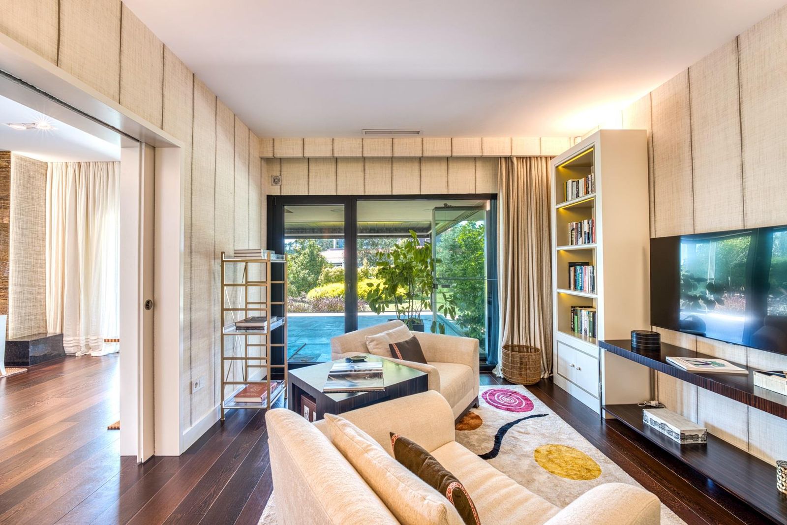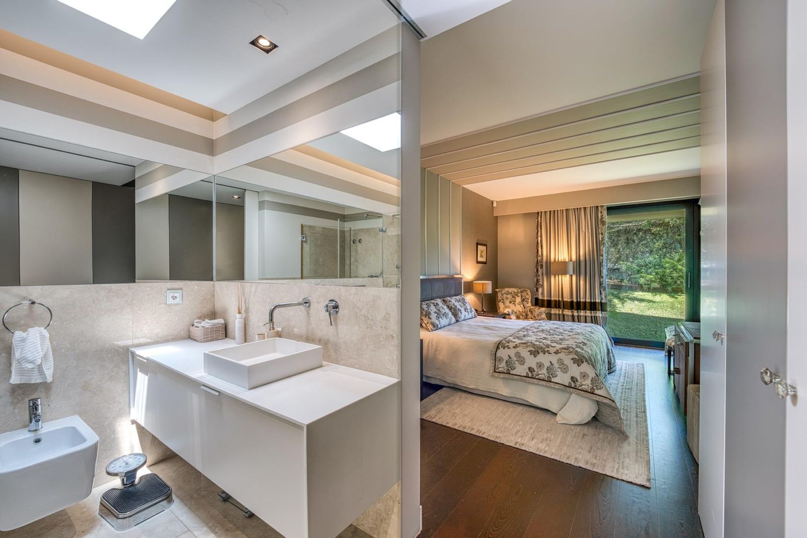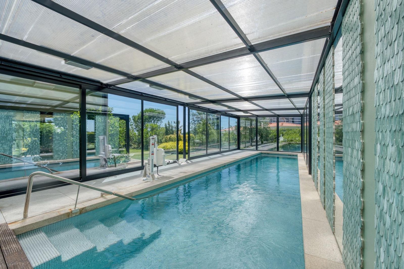O coração da casa apresenta uma cozinha moderna equipada com electrodomésticos Gaggenau, integrada a uma acolhedora sala de pequeno-almoço e a uma ampla área de estar/jantar. Três quartos localizam-se neste nível, sendo um deles adaptável como suíte ou extensão da sala de estar. A piscina interior liga-se diretamente ao jardim, criando uma transição harmoniosa entre espaços interiores e exteriores.