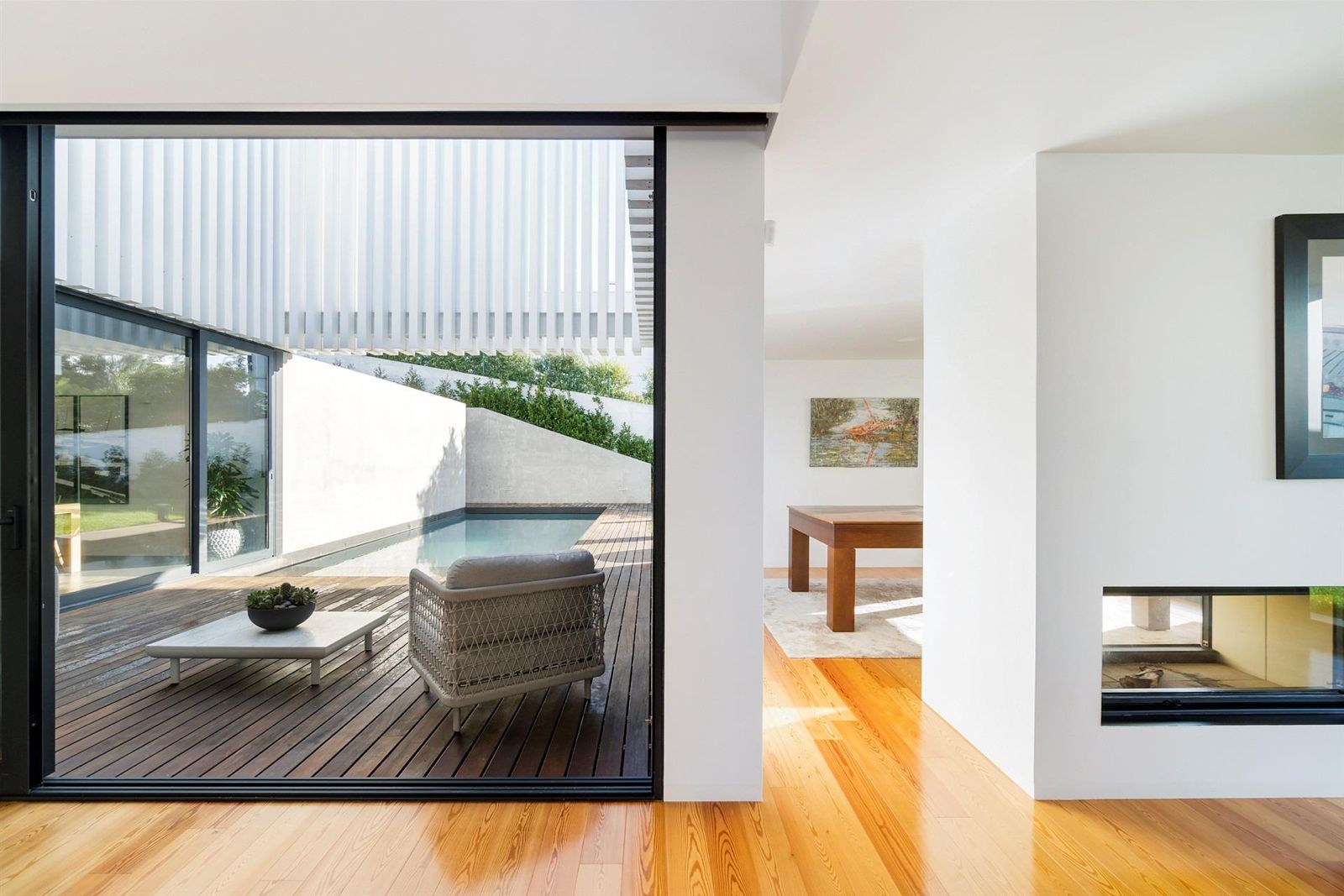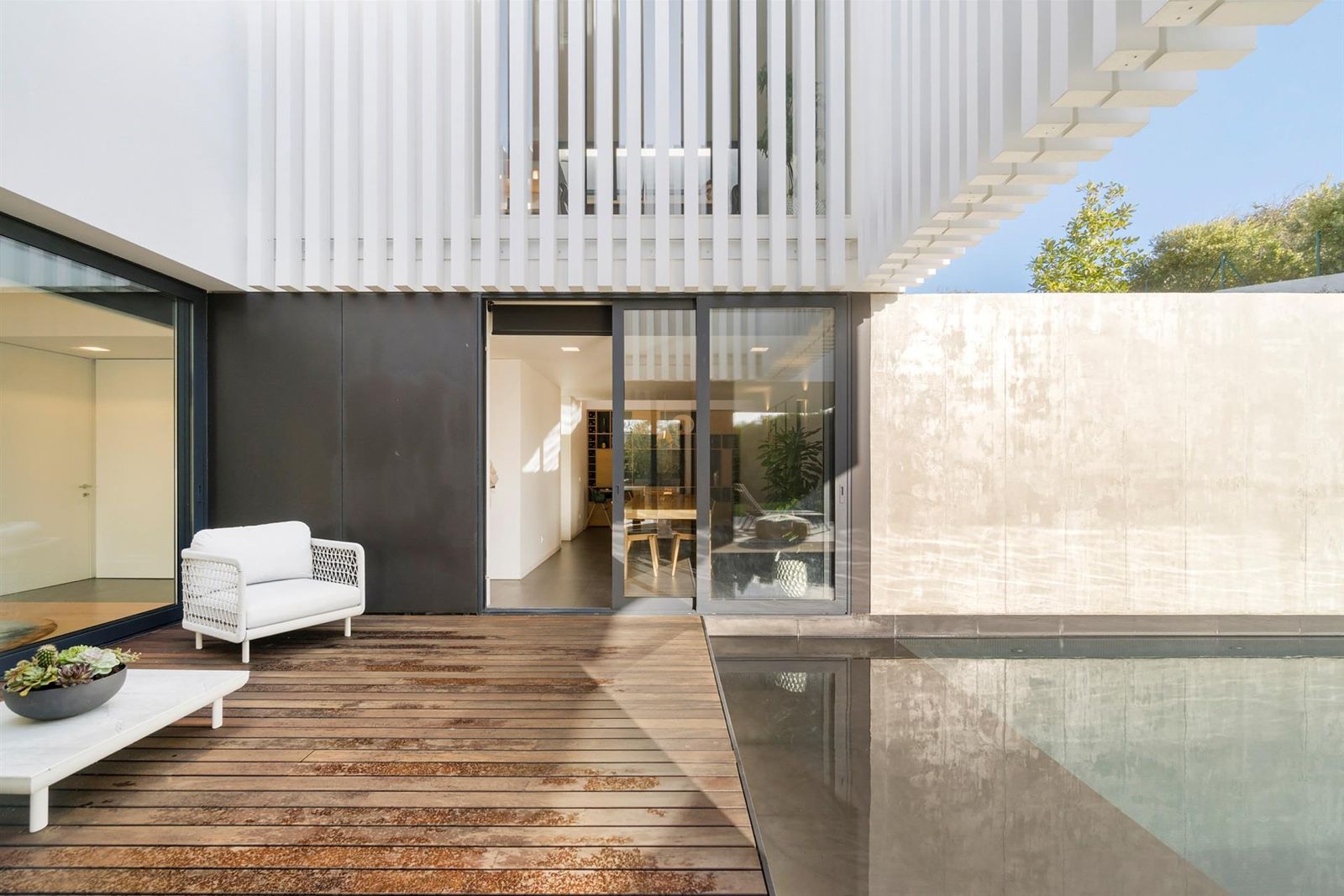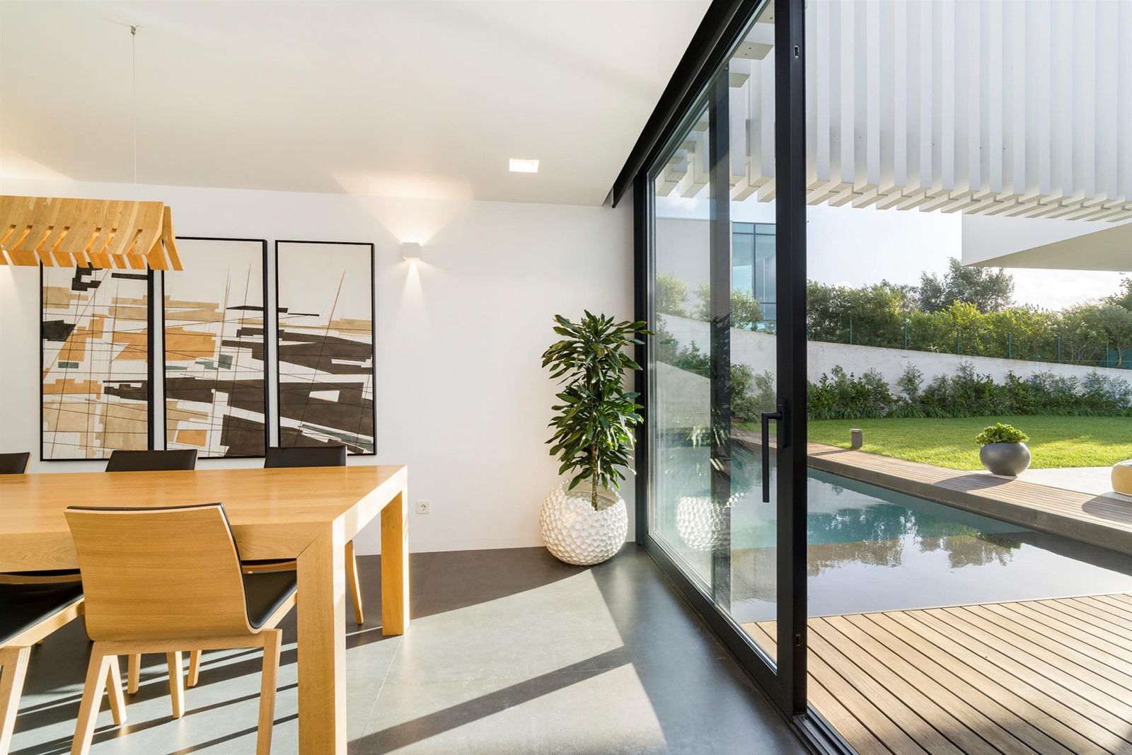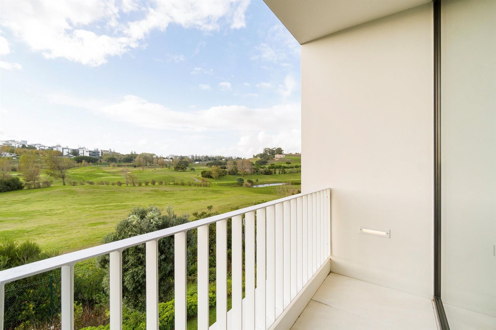 Os espaços exteriores foram meticulosamente projetados para aproveitar a vista desimpedida para o campo de golfe e a natureza envolvente. A piscina de água salgada, enquadrada por um jardim paisagístico, convida ao relaxamento.