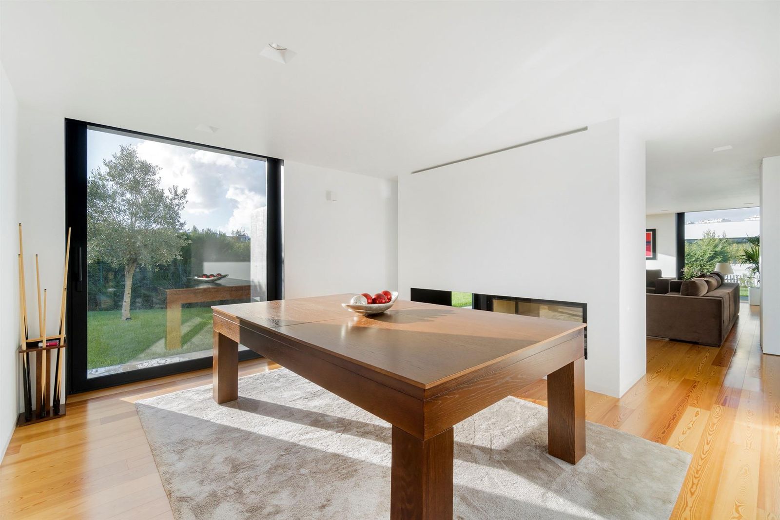 No rés-do-chão, descobre-se uma cozinha totalmente equipada com área de lavandaria independente, uma casa de banho de visita e áreas sociais elegantes: sala de jantar, ampla sala de estar e sala de jogos, unidas por uma imponente lareira dupla. A garagem, com capacidade para dois veículos, inclui arrumos e acesso direto ao interior.