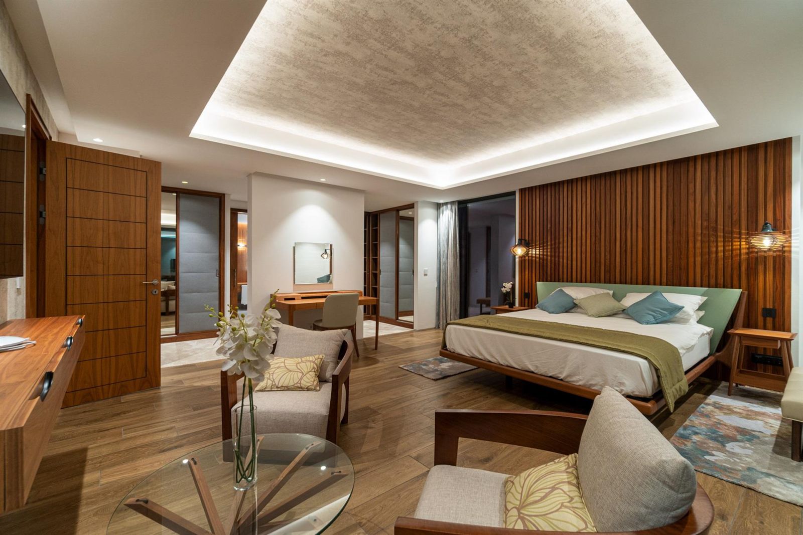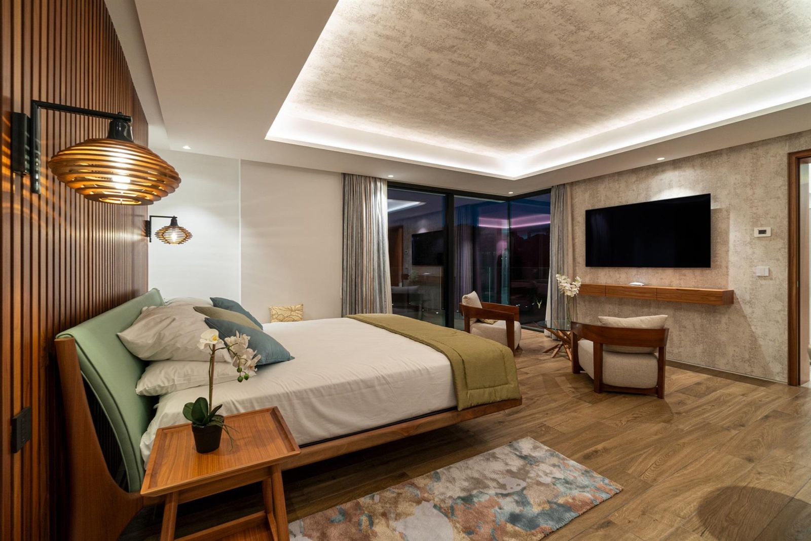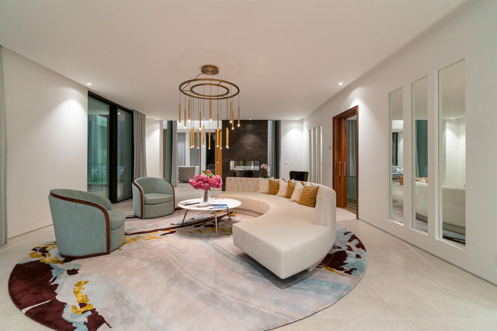 A vila harmoniza áreas sociais amplas, perfeitas para entretenimento. Portas largas abrem diretamente para o exterior, diluindo os limites entre dentro e fora. A cozinha aberta e a área de jantar incluem uma bancada de pequeno-almoço e uma impressionante adega embutida, ambas com vista para os terraços ensolarados. A propriedade oferece sete suítes generosas, cada uma com o seu próprio terraço, incluindo uma suíte para hóspedes com três quartos, sala de estar privada, terraço e entrada independente. A suite principal destaca-se com um closet, uma casa de banho luminosa e um duche exterior.